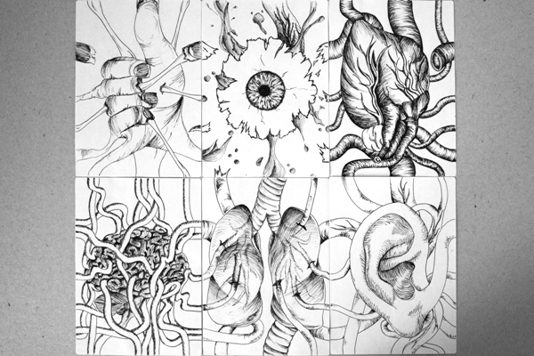 Autocollants --- Réalisations de six autocollants ayant des zones de liens, permettant de les rattacher ensemble afin de créer une fresque d'autocollants. Ses autocollants peuvent ensuite être exposés au milieu d'autres, réalisés par d'autres personnes, ils doivent pouvoir être reconnus grâce à un style graphique commun. |