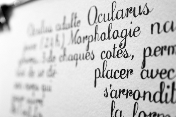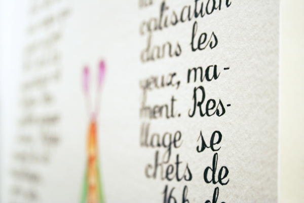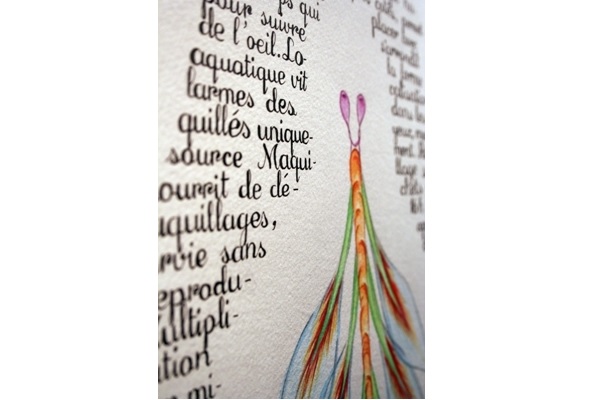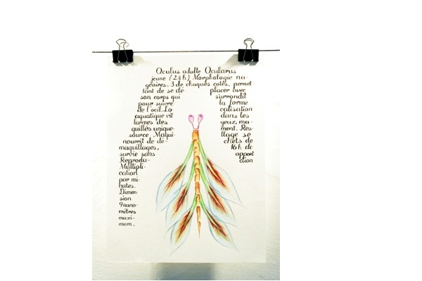 Bestiole --- Invention d'une bestiole, ensuite mise en couleurs à l'aquarelle. Puis invention de ses carcatéristiques, intégrées sur la même feuille que le dessin. |